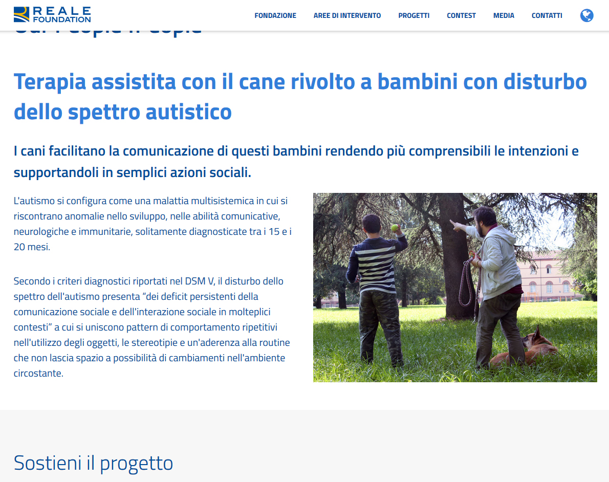 Associazione Contesto sta partecipando ad un BANDO di Reale Foundation per ottenere un finanziamento al fine di ampliare e proseguire il progetto di Terapia Assistita con il Cane rivolto ai bambini con il disturbo dello spettro autistico in cura presso il Dipartimento Materno-Infantile di Villa Rosa di Collegno.