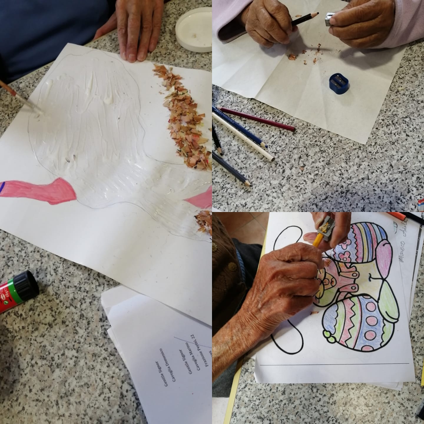 Il semplice gioco di memoria con le carte (in cui si deve trovare la coppia di carte identiche per creare gli abbinamenti corretti) non solo ha divertito alcuni ospiti, ma ha soprattutto consentito loro di socializzare perché dalla modalità singola sono poi passati al gioco in piccoli gruppi, aiutandosi reciprocamente a ricordare la posizione delle carte coperte. Per mantenere la mente allenata e stimolare la manualità fine, abbiamo usato dei piccoli chiodini colorati, da inserire nelle apposite tavolette, per creare immagini di fantasia in diverse tonalità. Rimanendo sul tema dei colori, abbiamo creato moltissimi disegni che hanno consentito di dar sfogo all’immaginazione e alla personalità di ciascuno, chi con abbinamenti più stravaganti chi con tratteggi più classici.